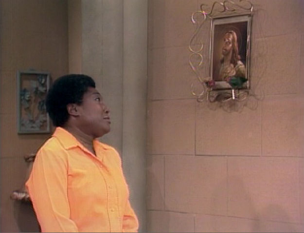 With Thelma and Michael’s first few lines, the show sets up two long-running character traits: Thelma is not exactly a culinary whiz, and Michael is a pro-black, anti-establishment militant. In fact, the show economically illustrates these two characteristics when Michael, peering into Thelma’s pot on the stove, comments, “Black is beautiful, Thelma, but not when it’s oatmeal.” And their older brother, J.J. (Jimmie Walker), before he is even seen, is established by Thelma as a loafer (“Where’s that big string-bean brother of yours? He was supposed to help me set the table, make the beds, and clean up!”). The matriarch of the family, Florida (Esther Rolle), is recovering from a recent operation to have her appendix removed, we meet her husband James (John Amos) when he comes home after working all night, and Florida’s best friend and neighbor Willona (Ja’ Net DuBois) pops in to share the news about her latest date.